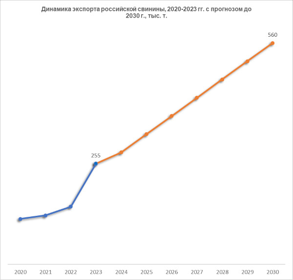 Согласно прогнозам, такая возможность существует, т.к. в ближайшие годы объем экспорта свинины из России будет только увеличиваться. Экспертами ЭКЦ «ИнвестПроект» прогнозируется возможное увеличение объёма экспорта российской свинины до 560 тыс. т к 2030 году.