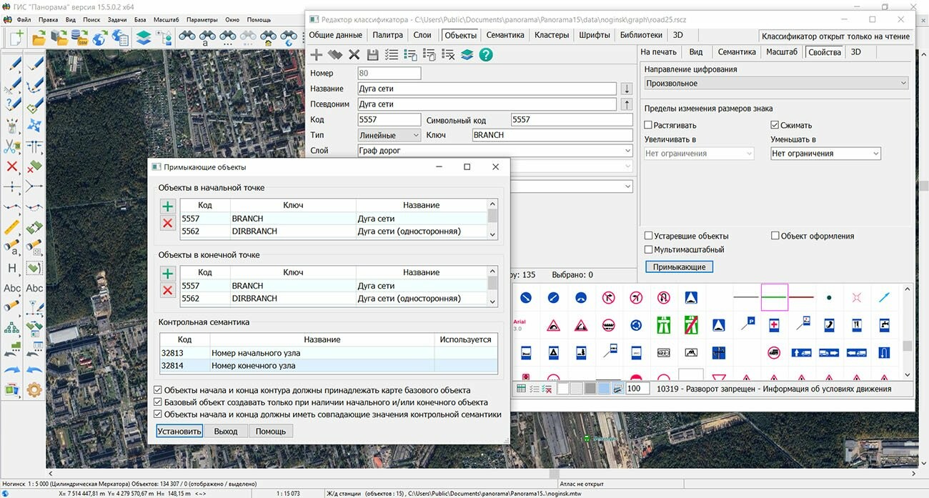 В задаче «Редактор классификатора» на вкладке «Объекты» в «Свойствах» добавлена настройка правил примыкания линейного объекта. При настройке правил выполняется выбор видов объектов, примыкающих к началу и концу контура объекта. Для связи примыкающих объектов используются семантики, выбираемые из списка обязательных семантик. Данные правила обеспечивают логическую связь между объектами карты для формирования сетей различного назначения. Примерами таких карт являются граф дорог, трубопроводные сети, сети связи и другие. Связанность объектов графа обеспечивается правилами примыкания. Линейные дуги сети графа связаны с узлами сети с помощью семантик «Номер начального узла» и «Номер конечного узла». Правила позволяют обеспечивать связь объектов на одной или нескольких картах, открытых в одном окне. Добавление правил примыкания повышает качество создания специальных карт и контроля уже существующих карт.