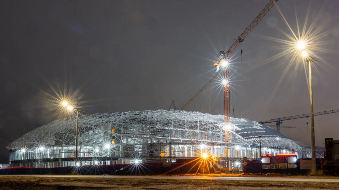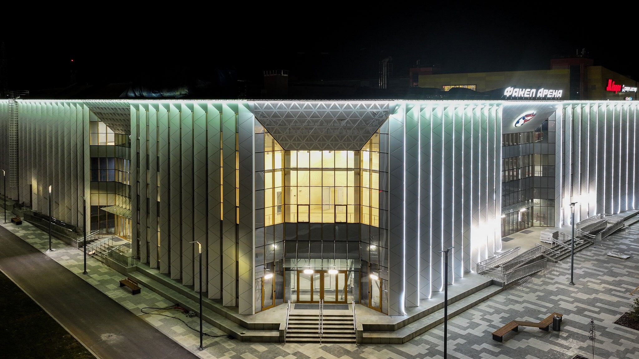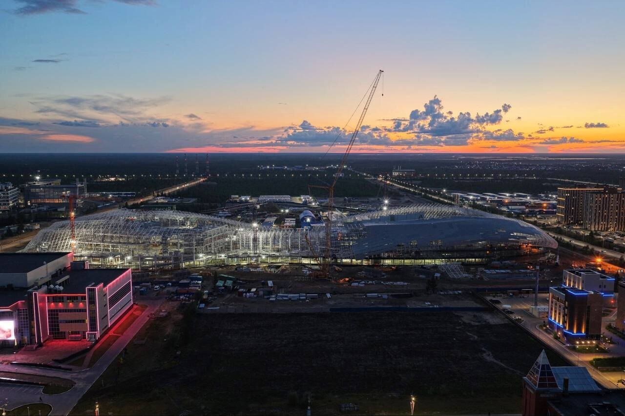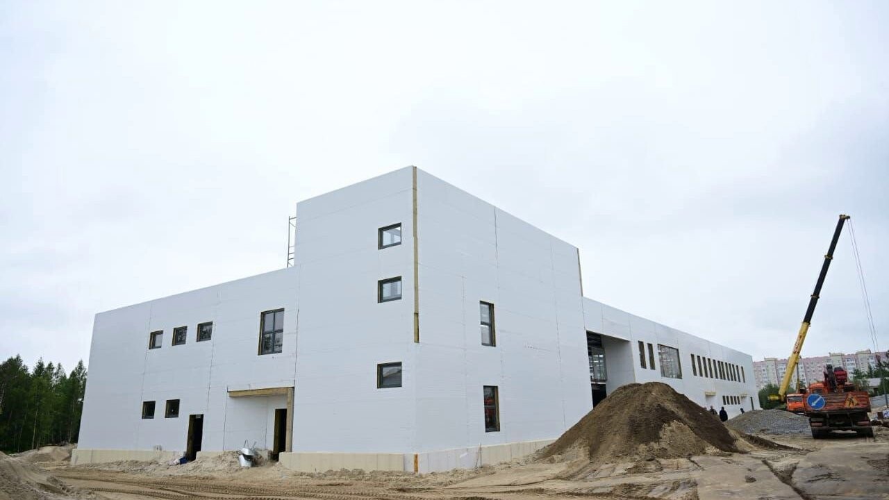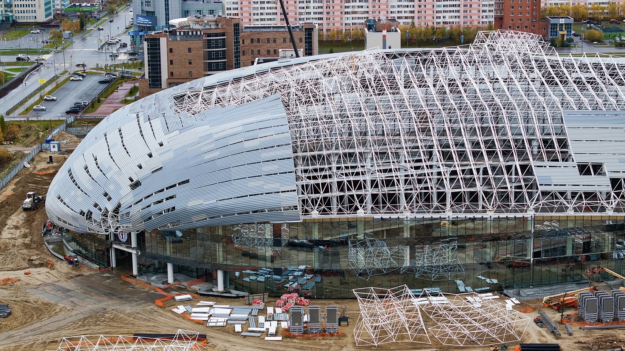 Строители уже завершили возведение каркаса, ведутся работы по монтажу кровли и обустройству фасадов из уникальных панелей, производимых в Тюмени.