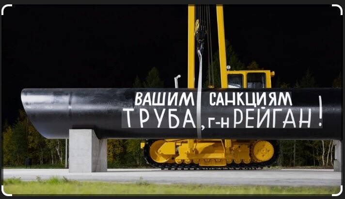 В основу композиции легла легендарная фотография 1982 года, сделанная при строительстве газопровода «Уренгой-Помары-Ужгород». Её история связана с историческим фактом: в декабре 1981 года президент США Рональд Рейган одобрил целый пакет санкций, в числе которых был запрет на продажу в СССР оборудования для нефтяной и газовой промышленности. Таким образом Вашингтон планировал сорвать строительство газопровода. Советская сторона приняла решение наладить импортозамещение и оснастить «стройку века» техникой собственного производства. Газопровод был в итоге достроен досрочно. На одном из участков строители нанесли вошедшую в историю надпись «Вашим санкциям ТРУБА, г-н Рейган!».