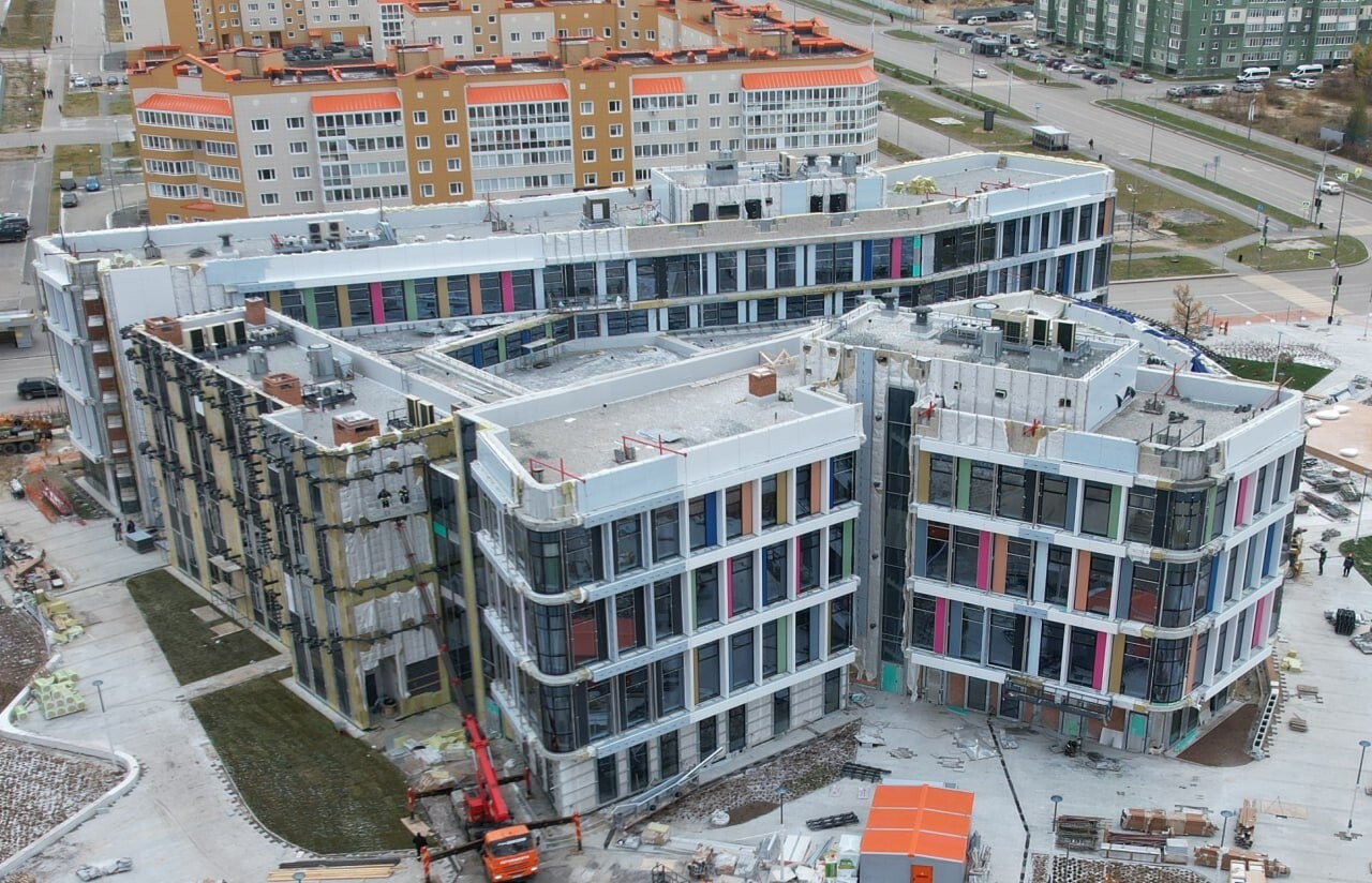 Строительство осуществляется в два этапа: на первом — закроют контур всего здания, на втором — предусмотрена внутренняя отделка и благоустройство территории. Продолжается кирпичная кладка стен, монтаж кровли и фасадов, работы по устройству наружных и внутренних инженерных сетей.
