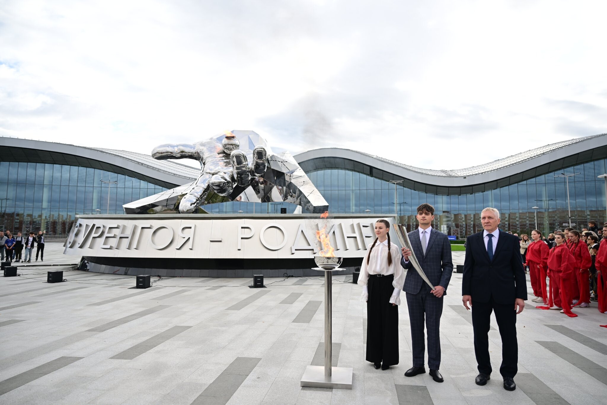 Благоустройство перед центром уже завершено и тут установлен монумент «Газ Уренгоя — Родине!», он посвящён пионерам освоения Севера. По задумке авторов скульптуры, рука первопроходца-газодобытчика, который, подобно Прометею, что принес людям огонь богов, даёт человечеству голубое топливо.