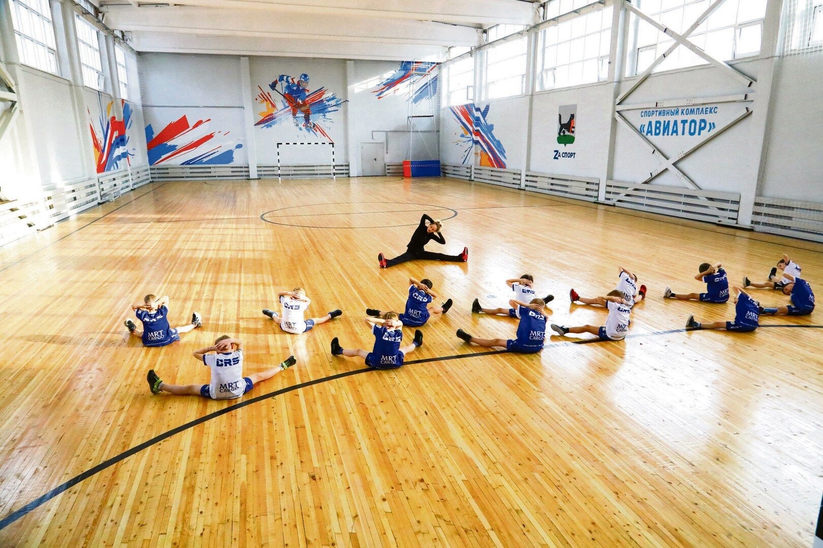 Настоящий деревянный паркет в зале — гордость «Авиатора»: с него аккуратно сняли старую краску, зачистили до дерева, выровняли, нанесли новую разметку и покрыли защитным лаком
