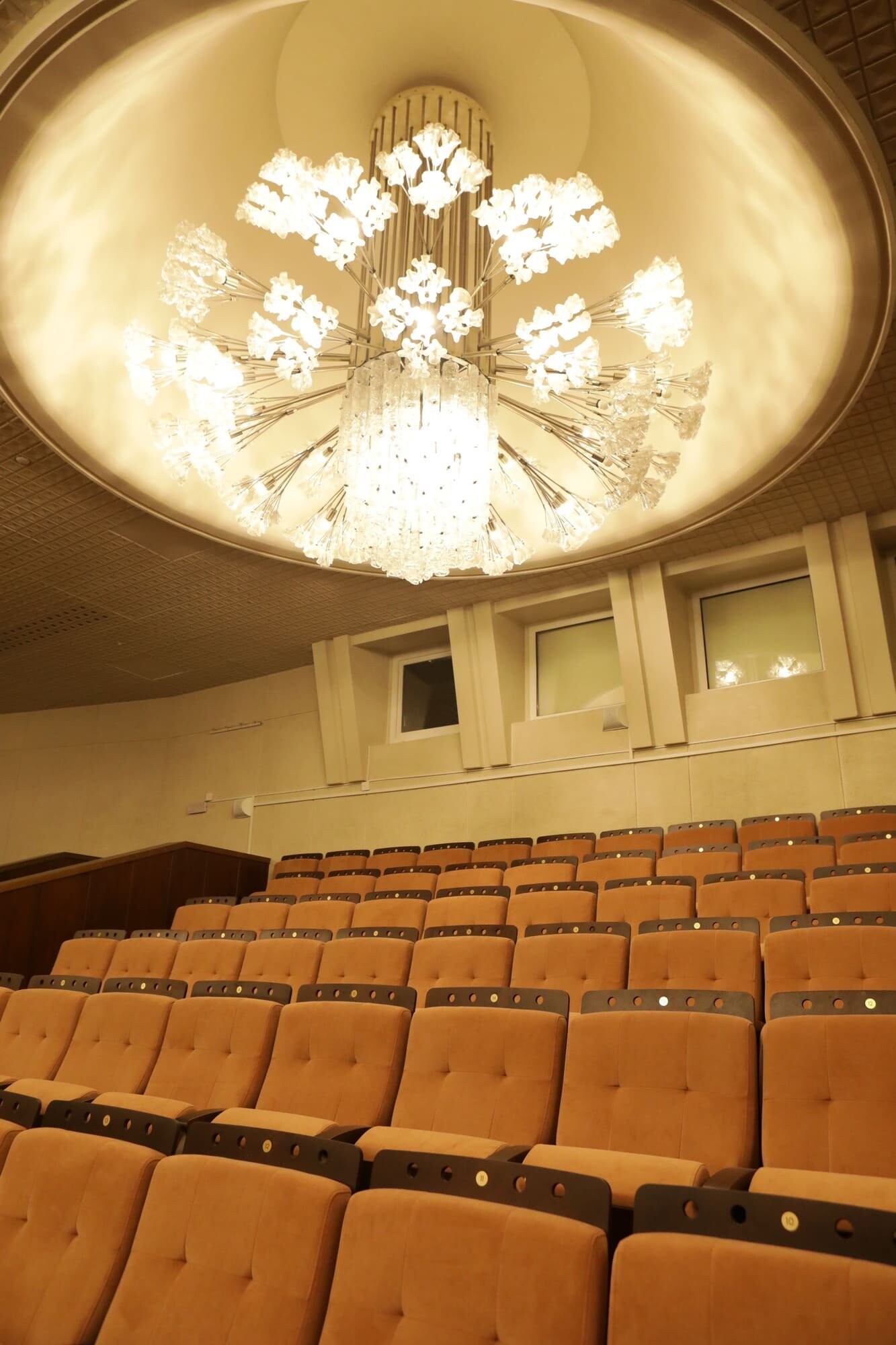 В зрительном зале установлено 878 новых кресел. Они снабжены акустическими панелями, которые представляют собой специальные отверстия в верхней части спинки и улучшают качество звука в зале. Анатомическая форма сидений позволит зрителям чувствовать себя удобно даже на длительных показах. Обивка кресел из огнестойкой шумопоглощающей ткани обладает высокой износостойкостью. Демонтированные театральные кресла передали в пользование учреждениям культуры и образования Иркутской области. В зрительном зале провели косметический ремонт дубового паркета — геометрию пола и мелкие повреждения выровняли по технологии циклевания и покрыли защитным лаком, на балконе полностью заменили покрытие пола.