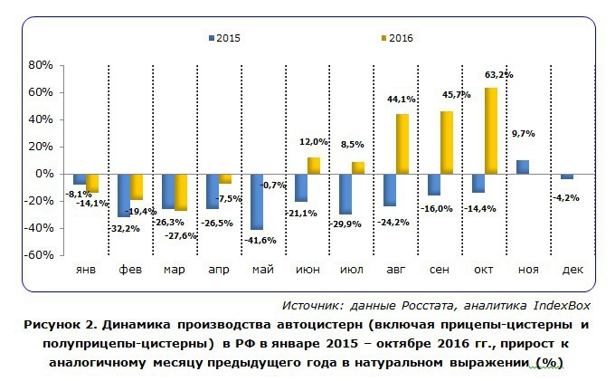 Пережив двухлетний спад, производство автоцистерн (включая прицепы-цистерны и полуприцепы-цистерны) в России начало восстанавливаться. Если в 2014 и 2015 гг. выпуск в годовом выражении сократился на 9% и 23% соответственно, достигнув 4,1 тыс. шт., то за январь-октябрь 2016 года отрасль показала прирост 8,7%. Позитивная динамика связана с эффектом низкой базы, отложенным спросом потребителей, отошедших от прошлогоднего кризисного шока, и увеличением гособоронзаказа, в рамках которого закупаются преимущественно топливные цистерны.