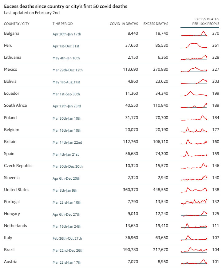 В этой таблице нет таких стран как Казахстан, Киргизия и ряд других, которые наверняка занимали бы первые строчки в таблице (судя по репортажам оттуда во время пика пандемии), но они скрывают или искажают свою статистику.