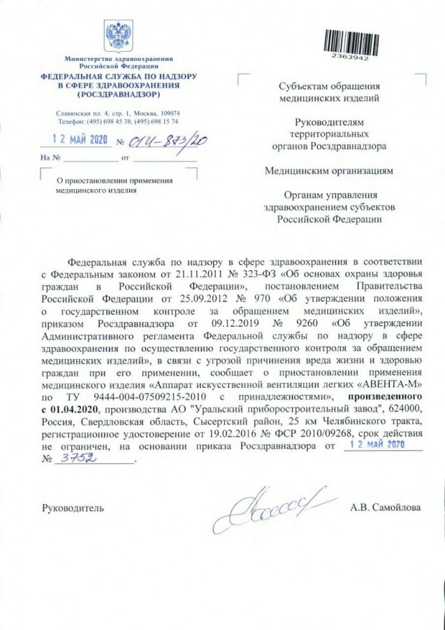 Речь идет об аппаратах ИВЛ «Авента-М», произведенных с 1 апреля этого года на Уральском приборостроительном заводе в Свердловской области. Именно эти аппараты использовались для оказания медицинской помощи в больницах в Москве и Санкт-Петербурге, где 9 и 12 мая произошли пожары.