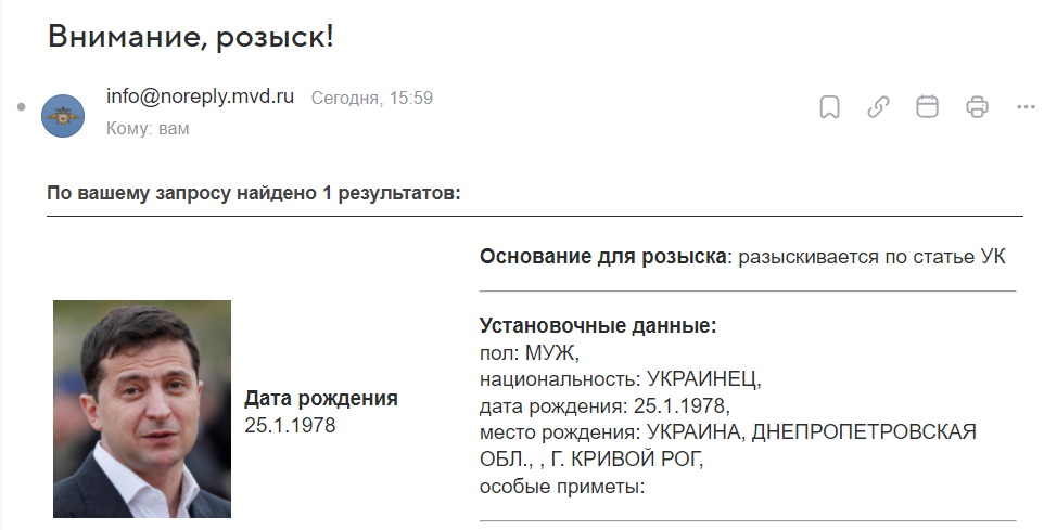 «Владимир Александрович Зеленский, 25.1.1978. Разыскивается по статье УК», — указано в базе.