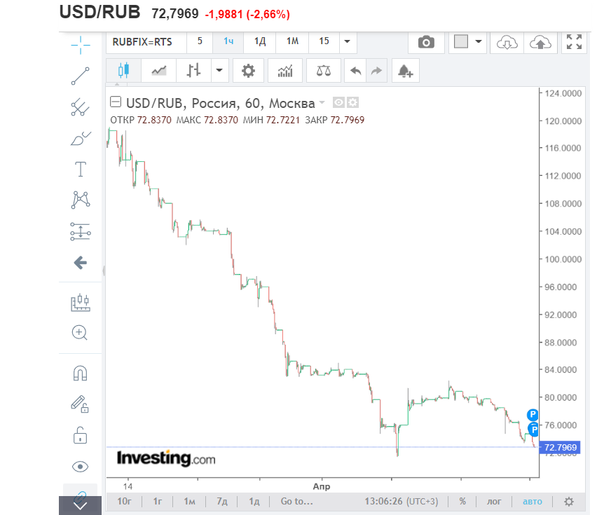 В конце апреля сообщалось, что рубль идет в числе лидеров роста и укрепления по отношению к доллару с начала текущего года среди развивающихся валют.