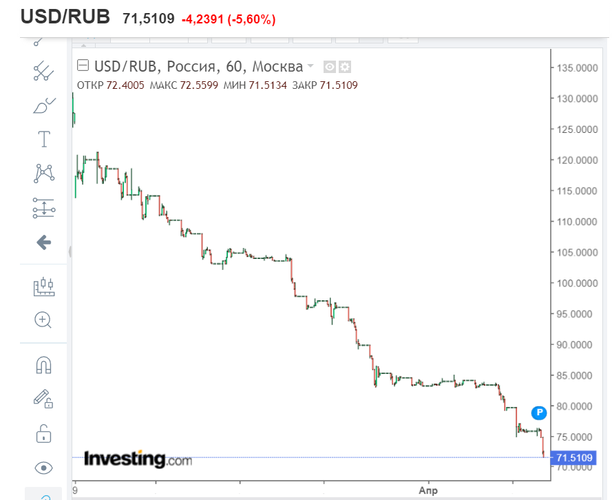 На 18 февраля они равнялись 645 млрд долларов, после чего начали падать до 1 апреля. Около 300 млрд заморожены в результате незаконных действий западных стран.